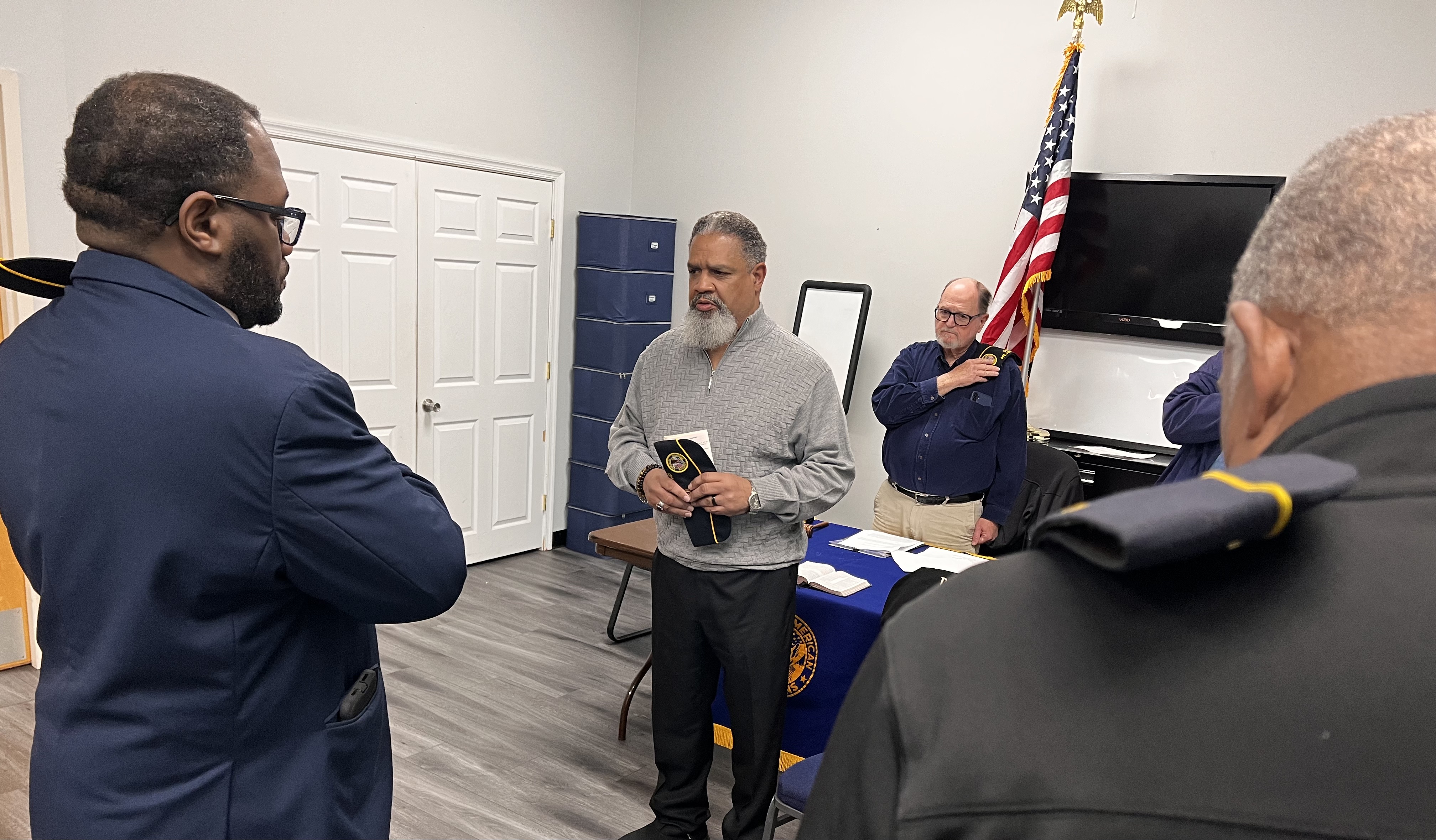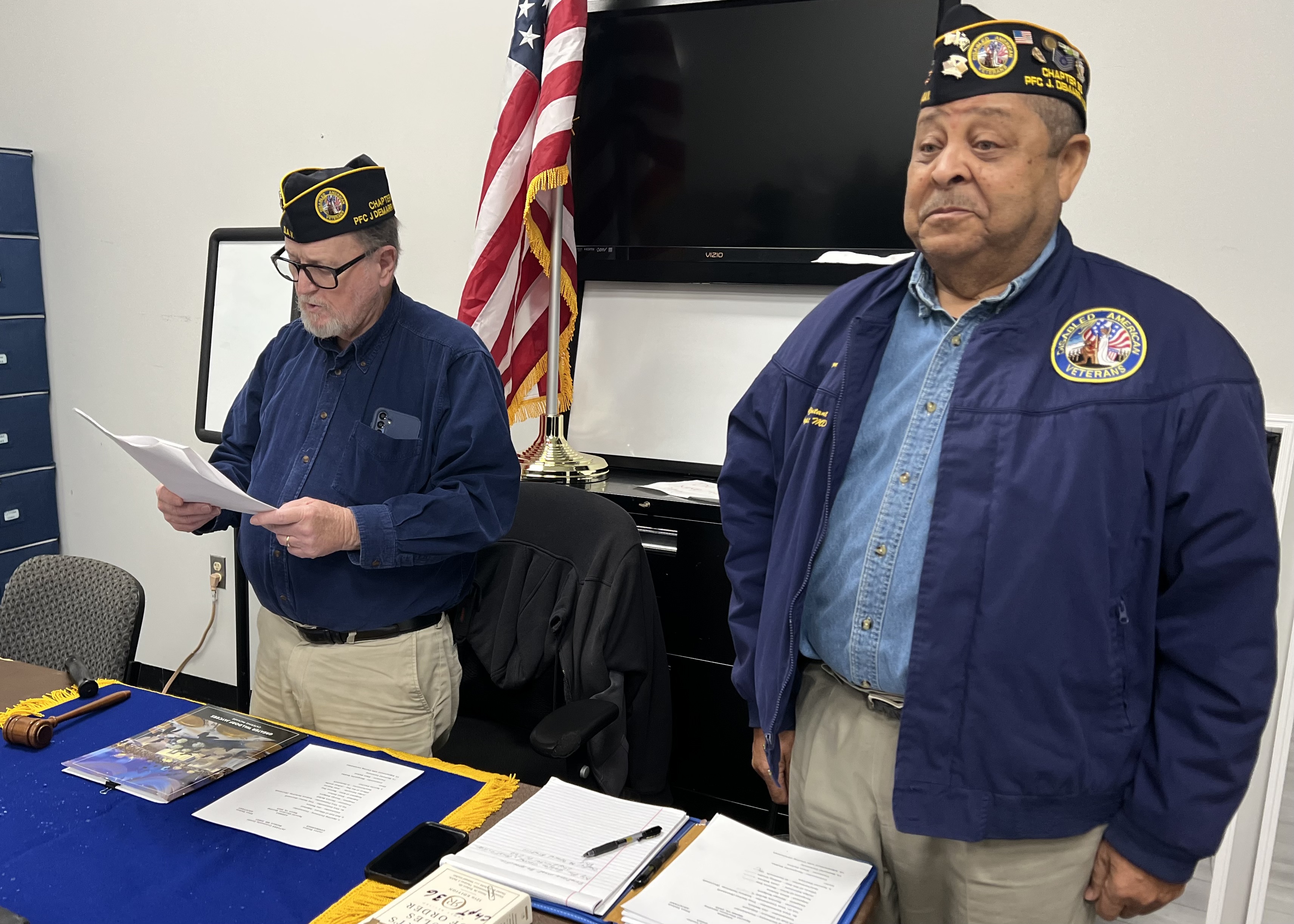 | Commander Jim Waters, right, and Adjutant Elton Stokes, left, preside over a Special Election Meeting for Disabled American Veterans PFC J DeMarr Chapter 36 held at the Waldorf Jaycees Community Center on April 8, 2025. |